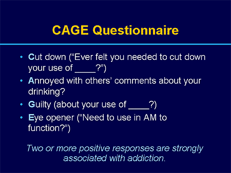 Ingenius Alcoholism Screening Cage Cage Questionnaire Is A Widely Used And An Extensively Validated Method Of Screening For Alcoholism Two Yes Responses Indicate That The Possibility Of Alcoholism Should Be Investigated